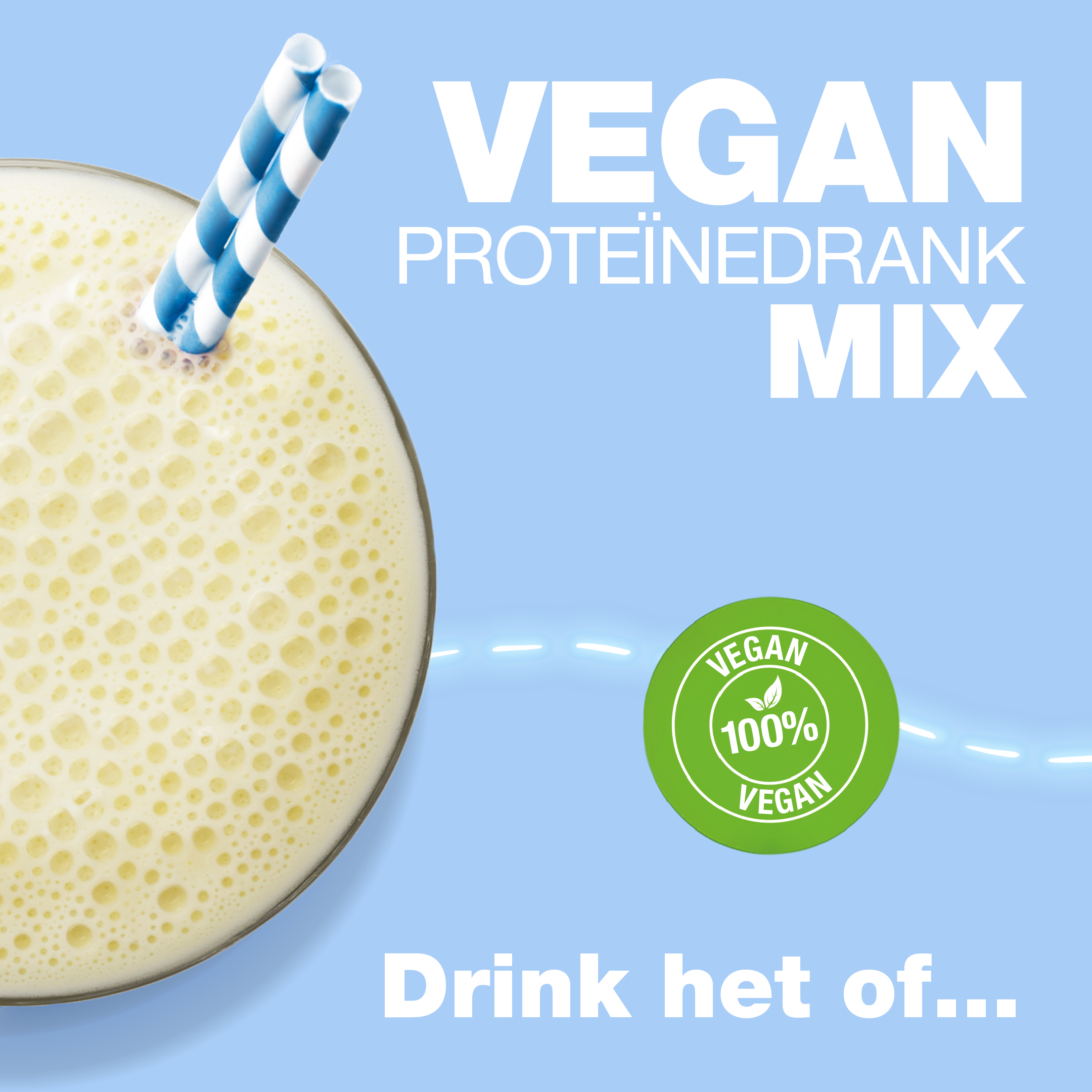 Je kunt Proteïnedrank mix Vegan ook alleen drinken als een gezonde shake, met 2 maatscheppen. Dat levert 15 g proteïne, 22 belangrijke vitaminen en mineralen en minder dan 1 g suiker per portie op.